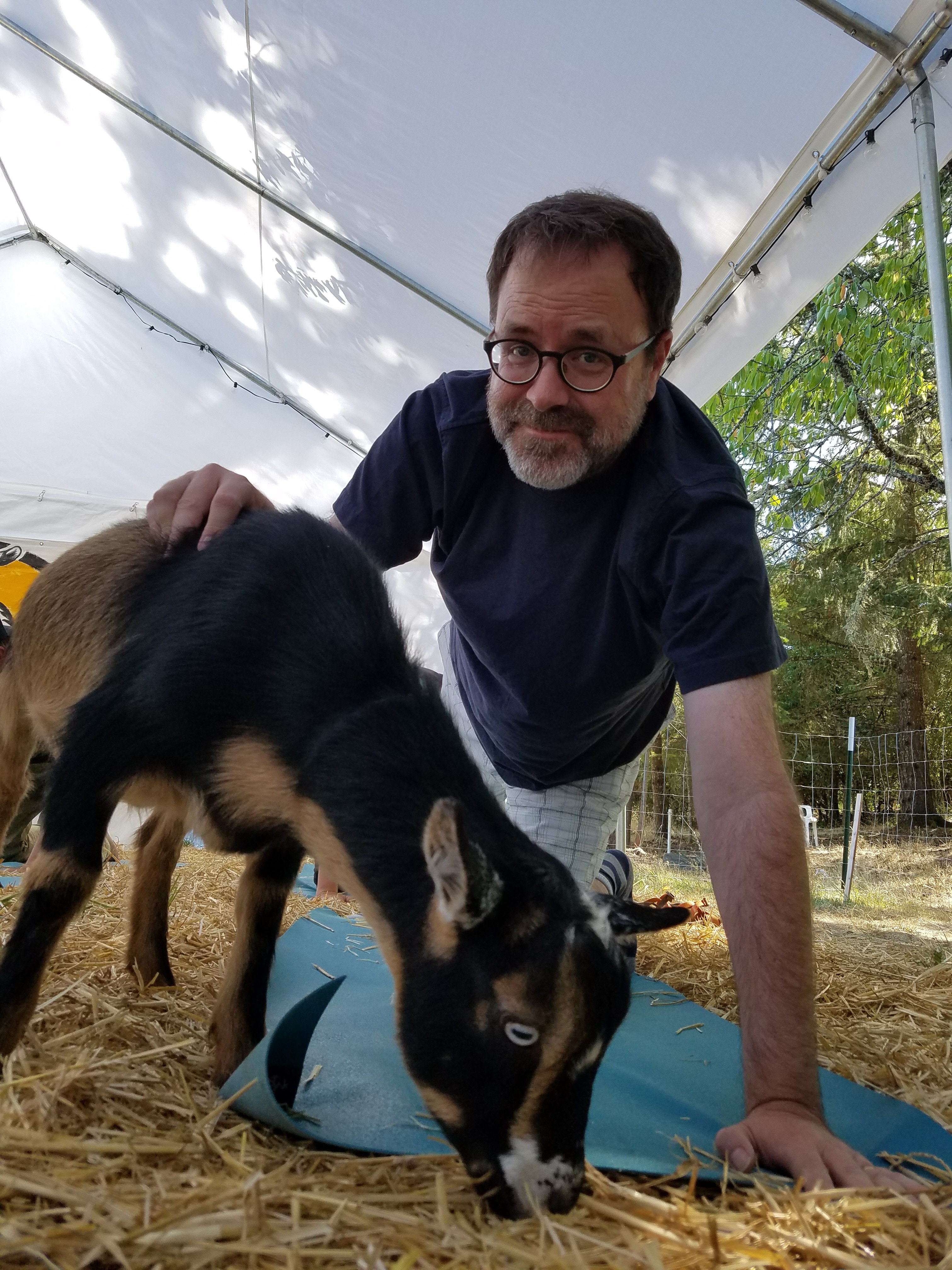 Goat Yoga is not on the list of official pre-eclipse activities at Oregon State. But here I am on a Friday afternoon, prone under a canopy on a borrowed mat covering a thin scattering of straw, listening to a yoga instructor direct me into a “downward dog” as a brown and white domesticated farm animal named Jim nuzzles on my elbow.