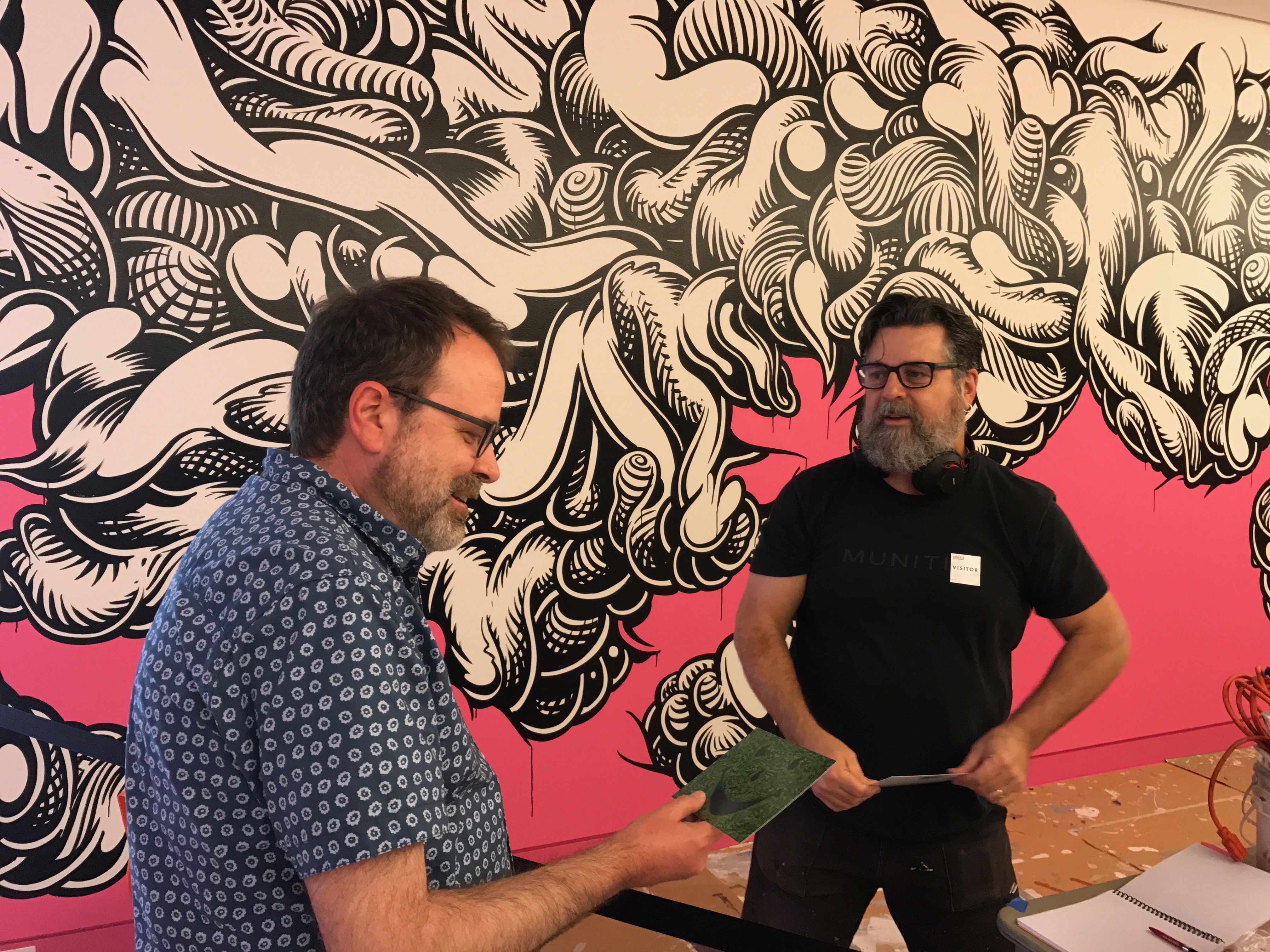On my visit I got the chance to watch Mark Dean Veca, a Brooklyn-based artist, as he put the finishing touches on “Maddest Hatter,” his interactive, immersive installation that greets viewers when the elevator door opens. You step into a fluorescent pink world of vivid color, fantastical shapes and psychedelic landscapes from floor to ceiling. No worries here about touching the art: You get to stand on it. There are even plush white beanbag chairs provided on which you can sit and contemplate the view.