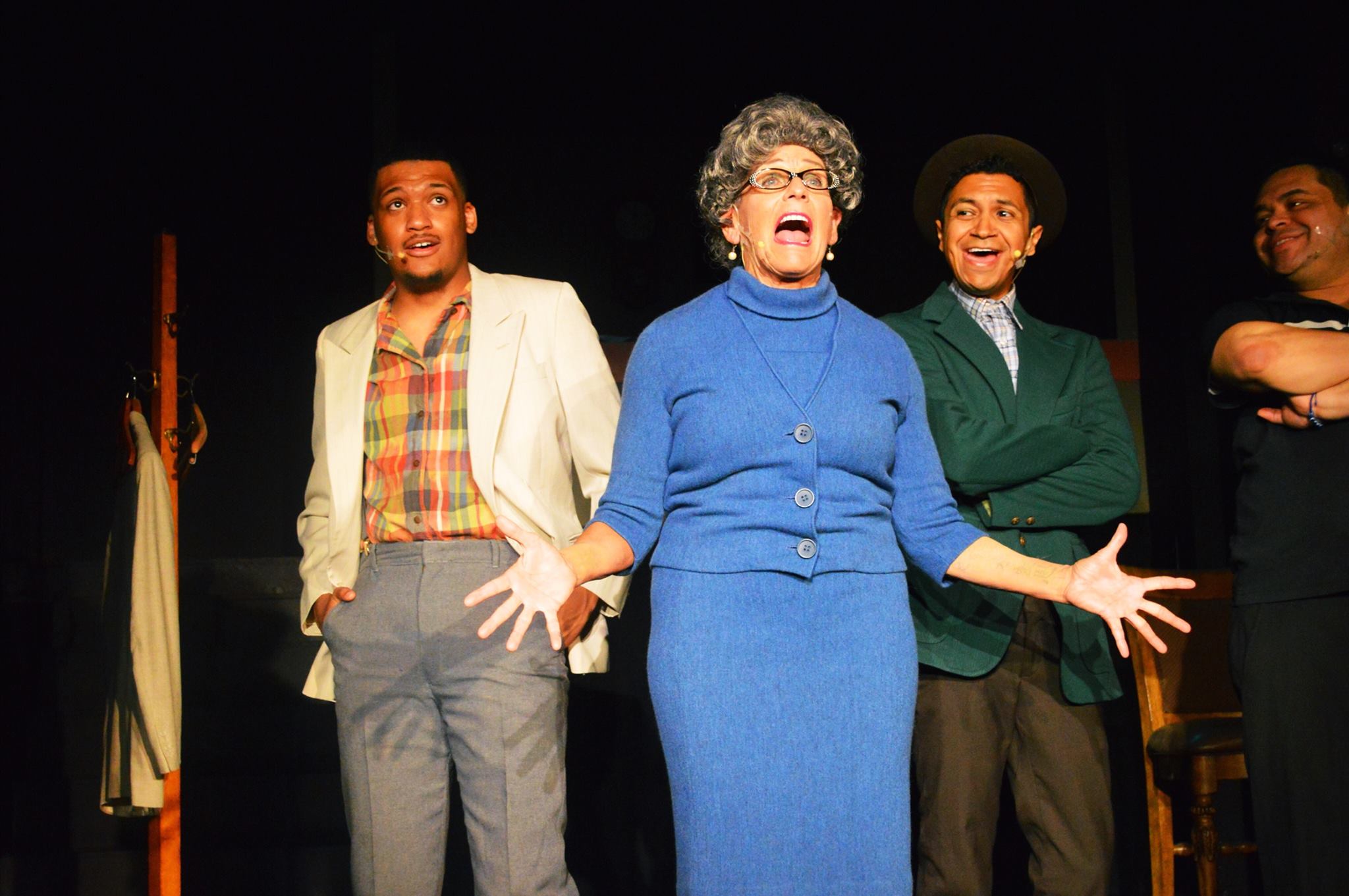 Direction and creative design (the strengths): Joseph Ham deftly adapts this complicated show for the tiny Reedley Opera House stage, creating a nightclub, gospel church, record store, and TV and radio studios, among other locations, with the most basic scenery. (He and Karl Jensen did the set design.) Ham draws strong and enthusiastic performances out of an ensemble that brings to the stage a variety of experience levels, and he helps mold them into a cohesive whole. The music performance tracks by Jeremy Hitch give a professional feel to the production (although at times they’re a little too loud).